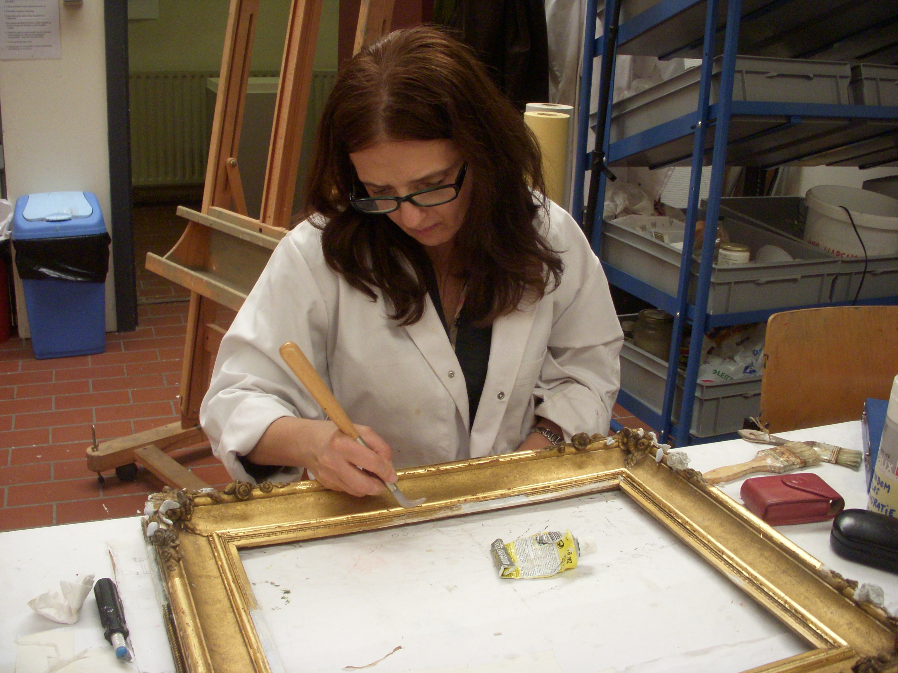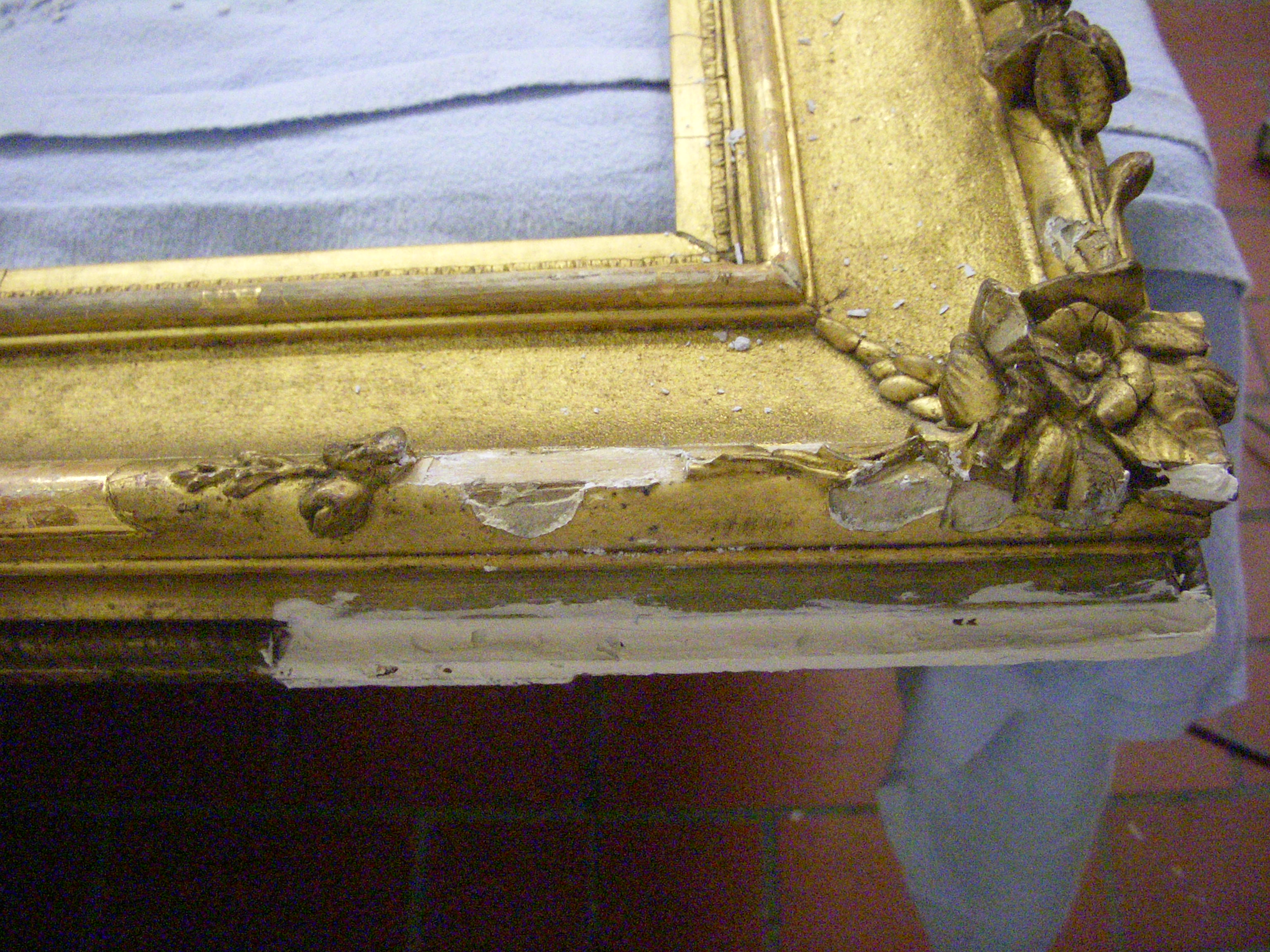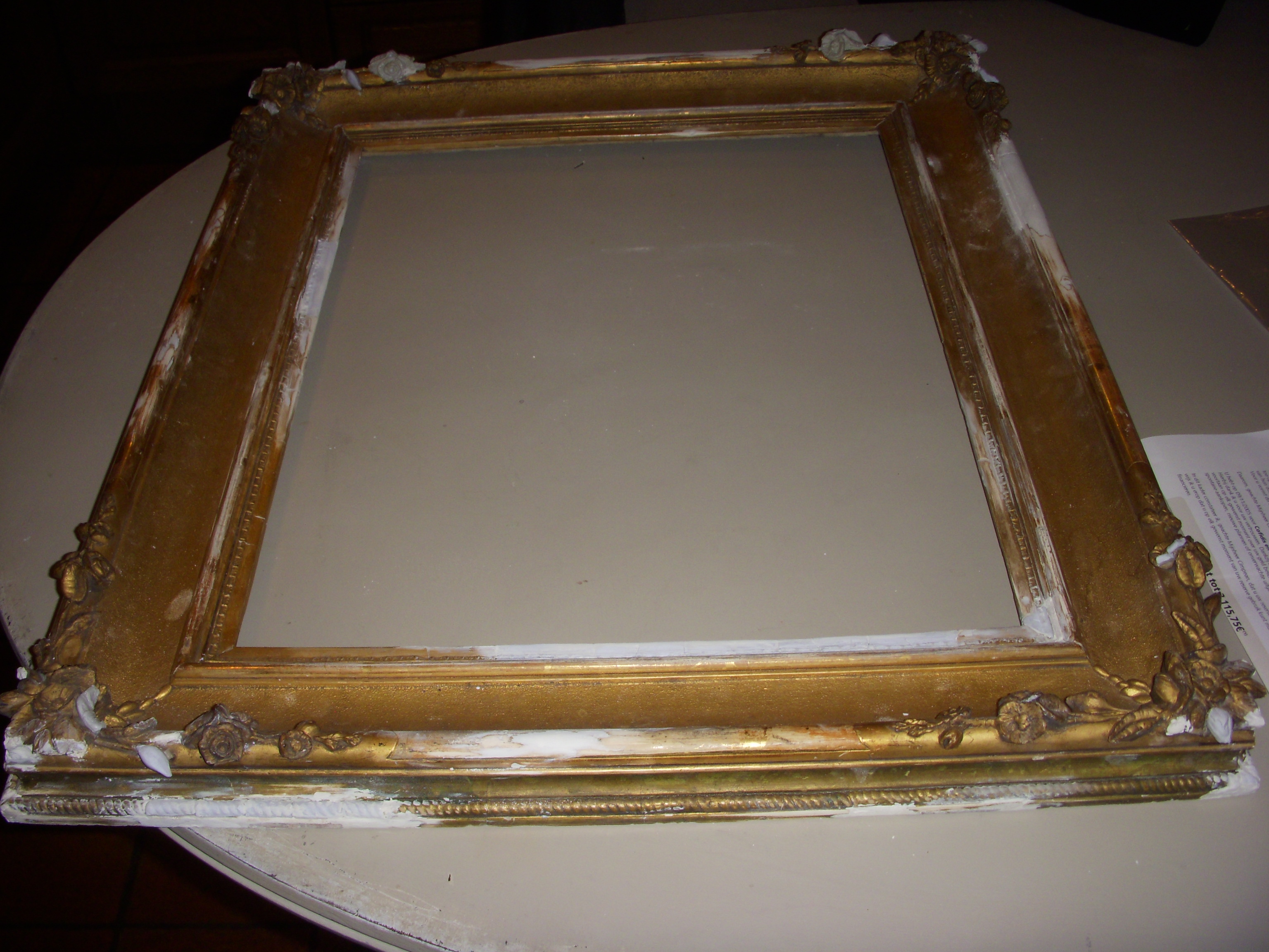 Lijsten herstel Voor restauratie : Missende ornamenten fixeren: Vergulden met bladgoud 24 krt. Lijst is herstelt :